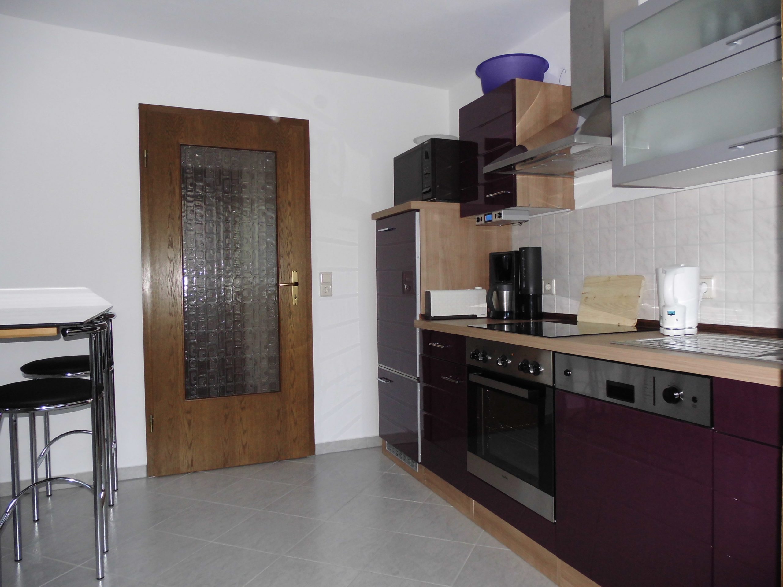 - komplett ausgestattete Einbauküche mit Spülmaschine und Mikrowelle, Tisch und 3 Stühlen